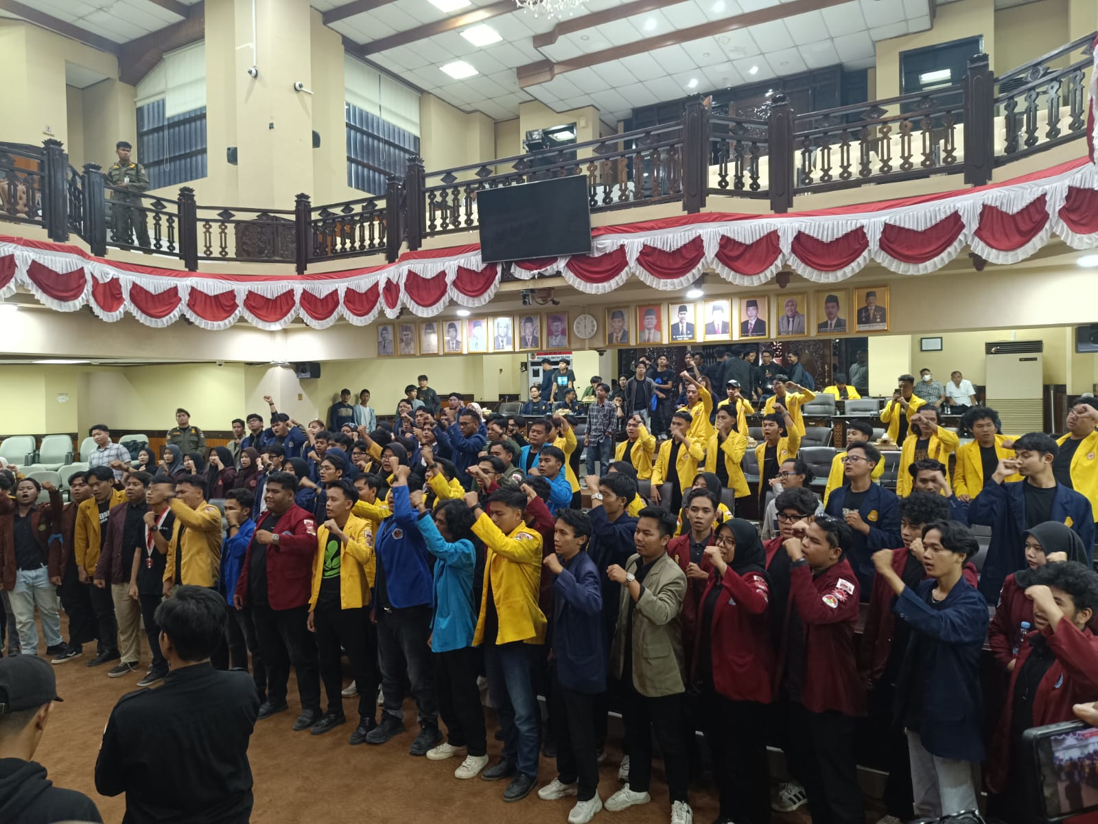 Para mahasiswa yang hadir dengan mengenakan almamater dari kampus masing-masing duduk di kursi anggota dewan, sebagian lainnya di lantai ruang sidang. Mereka bergantian menyampaikan orasi dan tuntutan dalam suasana tertib, mencerminkan kedewasaan berdemokrasi.